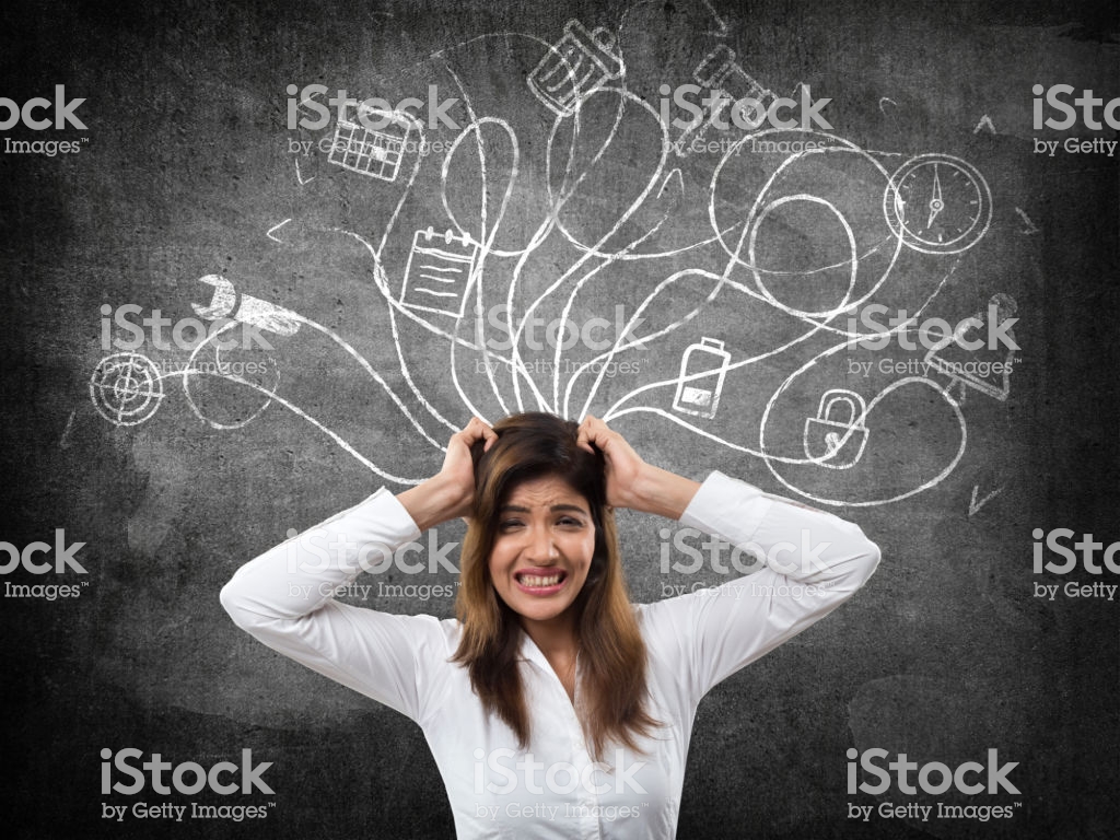 Stressed and frustrated businesswoman in front of blackboard with icons